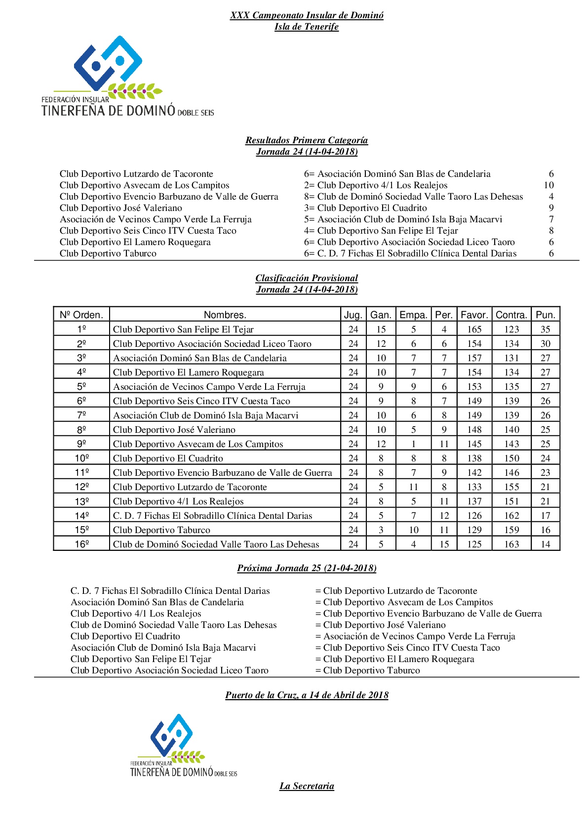 Resultados y Clasificaciones de la XXX Liga Insular de Dominó por Equipos. Jornada 24 Resultados y Clasificaciones de la XXX Liga Insular de Dominó por Equipos. Jornada 24 abril 16, 2018 doble6domino Comentarios 0 comentarios